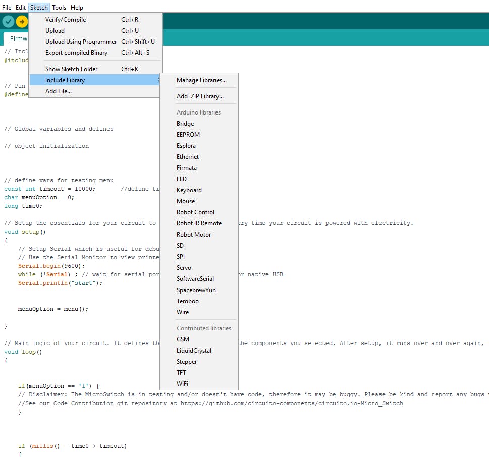In the code provided by circuito.io instead of adding external libraries like mentioned before, we provide them with the firmware folder. In this case, the IDE knows how to find them when using #include.