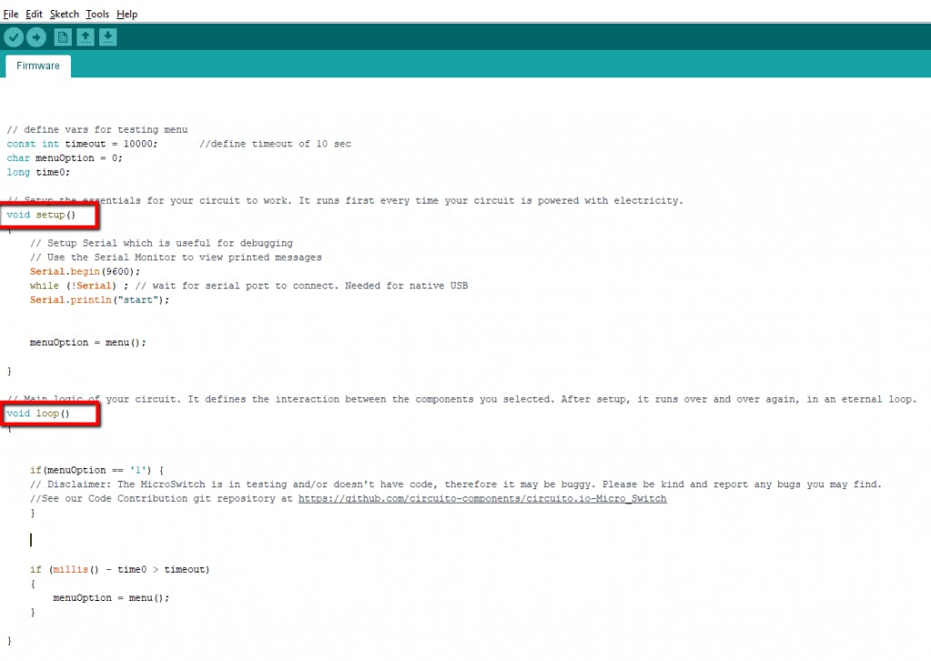 The loop function is also a must for every Arduino sketch and executes once setup() is complete. It is the main function and as its name hints, it runs in a loop over and over again. The loop describes the main logic of your circuit.