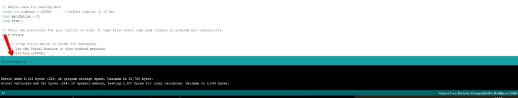 If there are any errors in the Arduino code a warning message will flag up prompting the user to make changes. Most new users often experience difficulty with compiling because of Arduino’s stringent syntax requirements. If you make any mistakes in your punctuation when using Arduino, the code won’t compile and you’ll be met with an error message.
