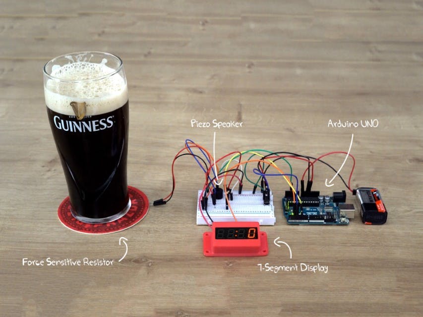 But for certain pressure-sensor applications, these extra features aren’t necessary. We used an FSR in our St. Patrick's day project, the ‘chug-meter’. It combines an FSR with a coaster to measure the weight of a pint of Guinness, starting a timer once the pint is off the coaster, and stopping it when the pint is put back.