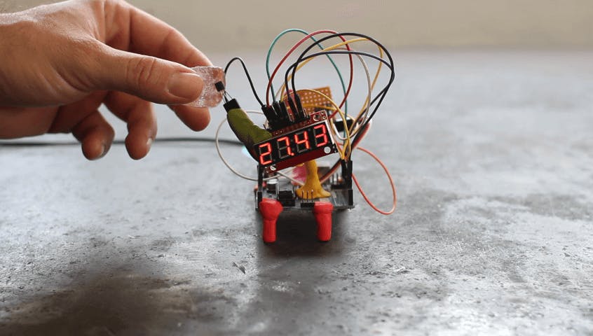 The numeric readout provided by our DIY digital thermometer is a simple application of the temperature sensor. If you can keep it moisture-tight, you’ll be able to leave it in your refrigerator, and see at a glance how cold it is inside. This device is a variety of digital temperature sensor, which outputs values along a single wire; it doesn’t even need to receive power along a separate one, making it a convenient choice.