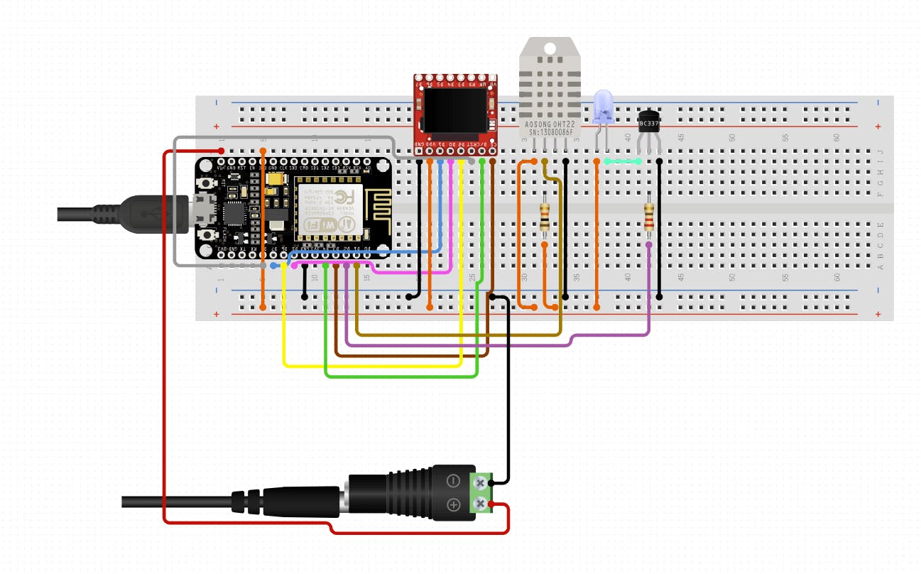 Our NodeMCU-powered smart-thermostat incorporates the DHT22, which uses a thermistor to measure temperature, and another embedded sensor to measure humidity. The two sensors are connected internally to a microcontroller which outputs a digital signal along a single wire. This extra stuff slows the circuit down a little, with samples being taken every two seconds – but for our purposes this wasn’t a problem.