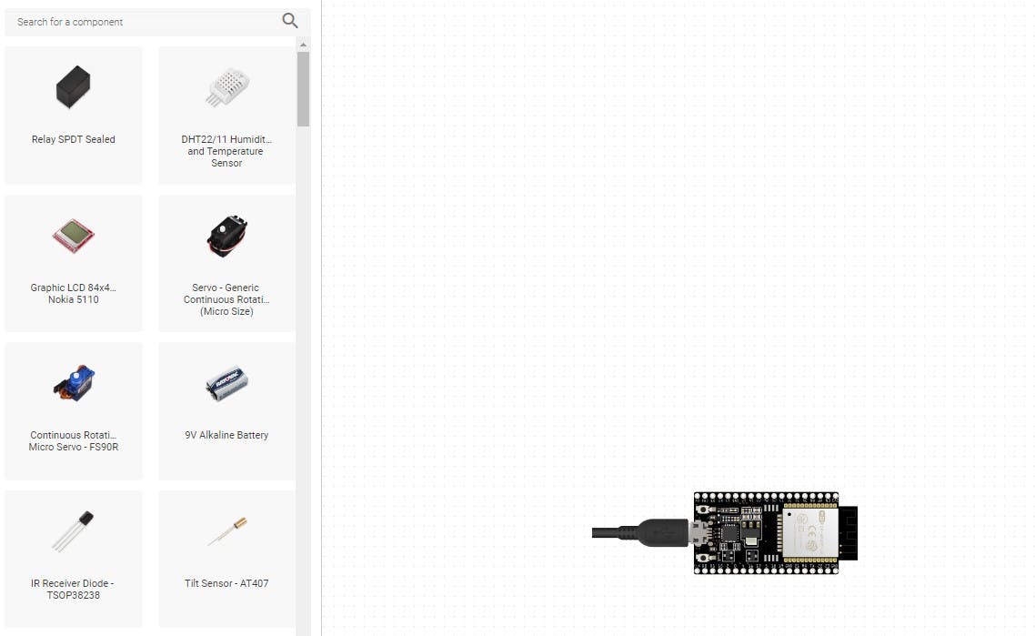 If you want to design a circuit using ESP32 dev kit, you can either type esp32 into the search box, or click on the "controllers" tab and locate it. After you find it, simply drag and drop it into the canvas. Alternatively, you can click on the ESP32 DevkitC icon and then click ‘swap’. This will replace the Arduino with the ESP32 dev kit. You can then add components in the same way that you would with the Arduino; wiring, supplementary components and breadboards will be added automatically.