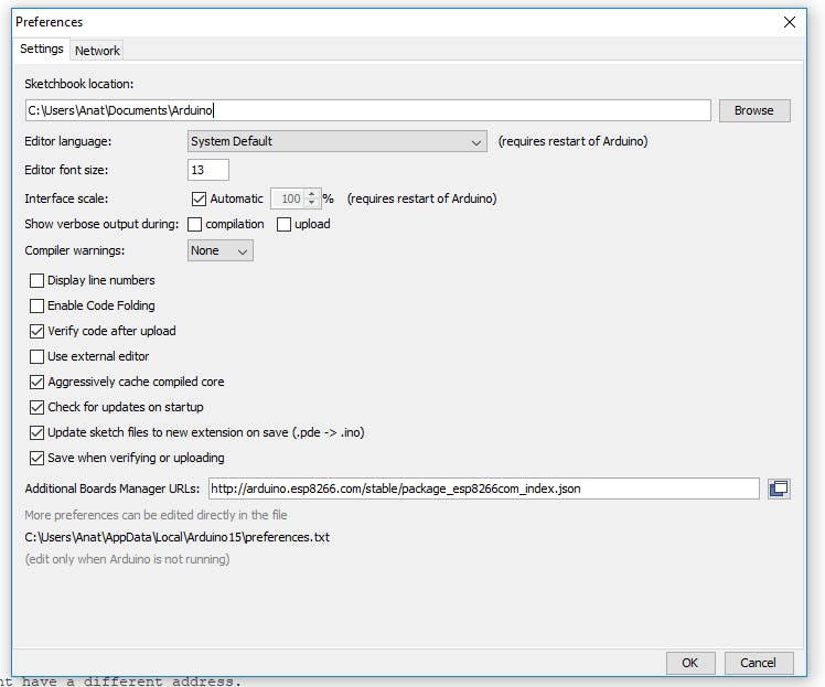 2. In the space marked “additional Boards Manager URLs” add the following url: http://arduino.esp8266.com/stable/package_esp8266com_index.jso