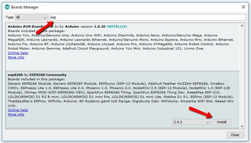5. Type “ESP8266” into the resulting search bar. Then install the package.