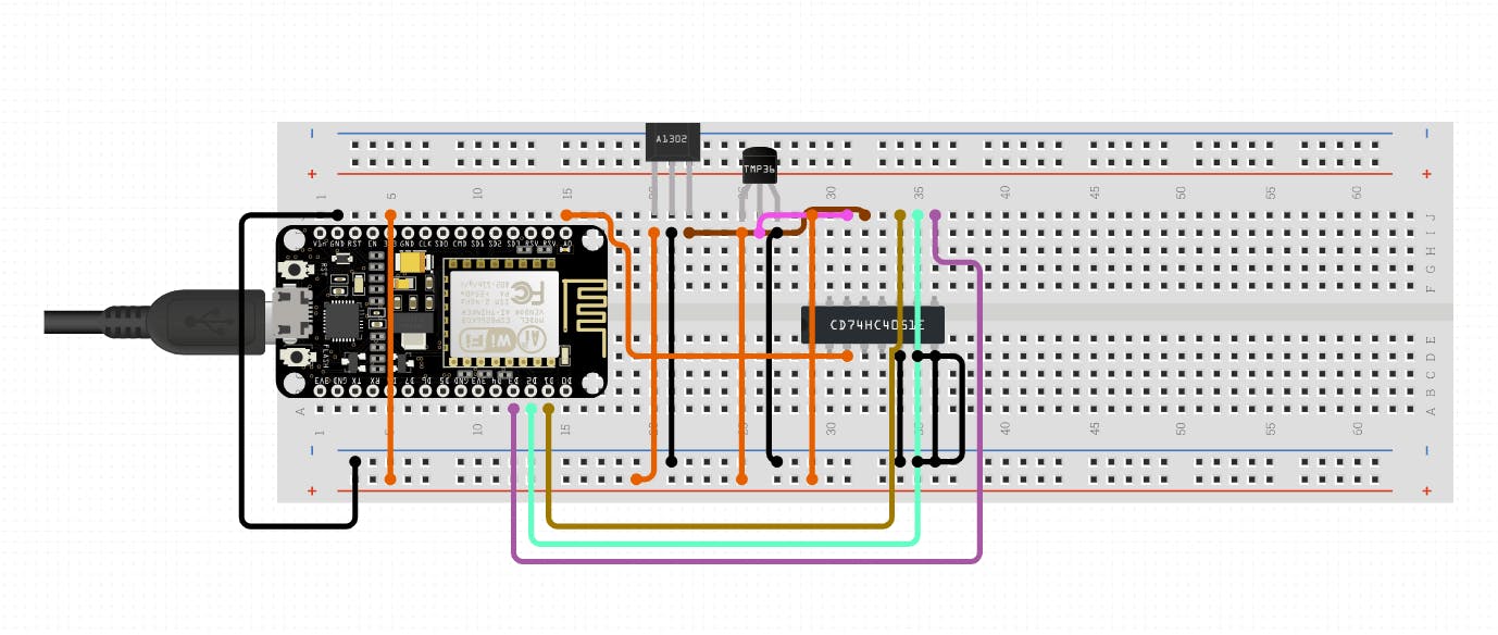 For example, if you decide to wire an analog temperature sensor and a hall effect sensor, the multiplexer will appear on the breadboard automatically. The mux behaves just like any other passive devices like resistors and capacitors.
