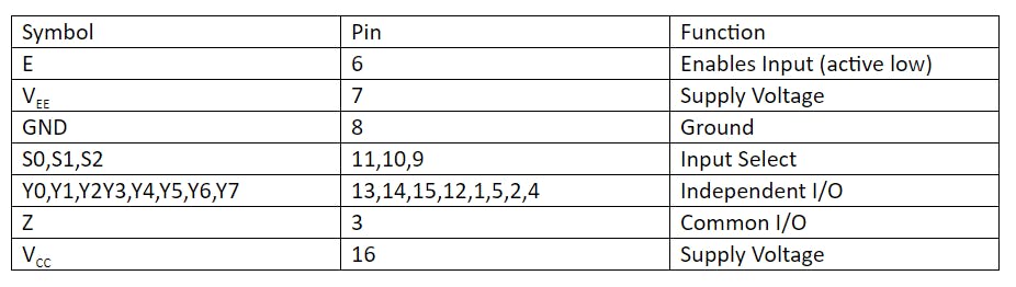 Eight of these pins are used as inputs (or outputs), and they’re routed to the common ‘Z’ pin number 3 depending on the voltages present at the ‘select input’ pins 11, 10 and 9.